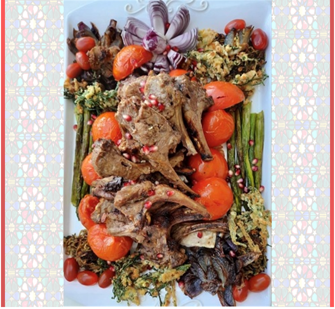 "Mast-o-khiar": Minty yoghurt with cucumber appetiserNoodles from scratch for herbal noodle soup ("Ash-e-reshteh" in persian)Salmon and vegetables in puff pastryPotato quiche ("Kookoo sabzi")Lamb ShankMeatballs ("Lamb Koftas")Sour cherry pilau dish ("Albaloo polo" in persian)20 person catering eventFruit platterPreserved olives ("Zeytoon parvardeh")
