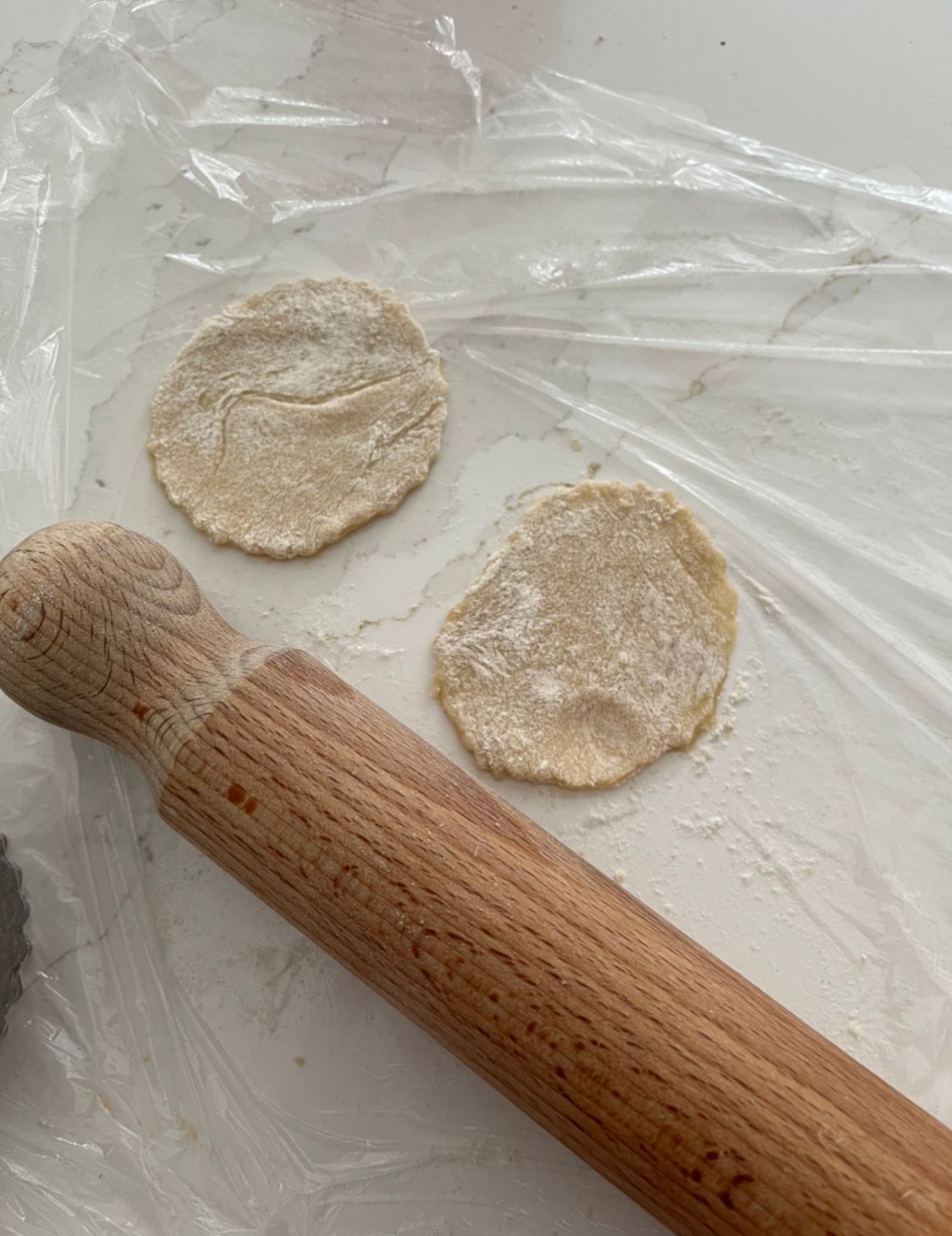 - Once risen and ready to be rolled, roll the dough to 0.5 cm thickness before cutting out glass-sized circles