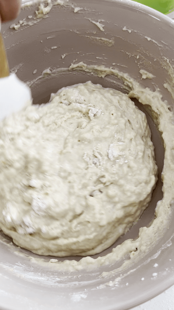 - Mix in the oil, salt and a pinch of vanilla syrup before also adding the sourdough and water mix followed by the flour