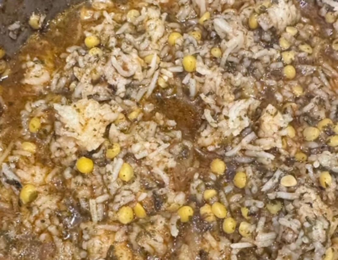 - Add the diced herbs to the onion pan, followed by the rice and split peas